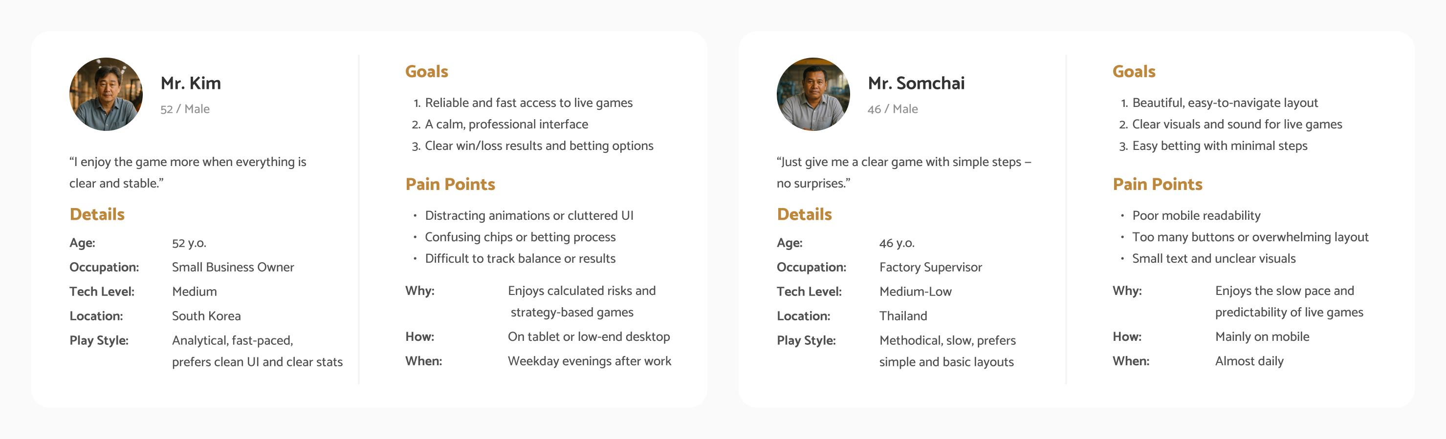 Context: A legacy live dealer provider needed to revamp their 15-year-old platform covering Baccarat, Roulette, Blackjack, and Sic Bo.